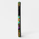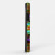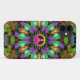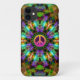 Custom phone cases made with bright psychedelic rainbow colors, geometric patterns centered with a pink and orange peace symbol | art by webgrrl.biz