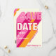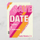 An exuberant pink and orange save the date announcement for your wedding. Long shadow text with diagonal stripes in shades of pink and orange stretches across the card emphasizing the Save the Date message. A unique and really cool first impression for your wedding with retro vibes–when your guests get this card, they know that fun is ahead. Bold retro typography for a retro seventies feel. The back of the card has striped accents on the corners, your monogram. a place you can add more information, and a QR code so guests can visit you wedding website.