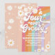 Celebrate your little ones special day with this retro groovy birthday invitation featuring a rainbow pastel background, playful daisies, peace signs, hearts, stars, and butterflies. Perfect for a 4th birthday party, this colorful design captures the fun spirit of the 70s with a modern twist. Guests will love the vibrant, whimsical style that sets the tone for a joyful celebration. Customize with your party details to create a unique keepsake that shines with peace, love, and fun.