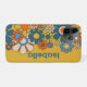 Groovy Retro 60s 70s Flowers Personalized iPhone Case. Fun, cheerful, and whimsical, with a vintage 1960s 1970s vibe. With mustard yellow, orange, and blue tones. Name text can be personalized / customized. By Kierkegaard Design Studio.