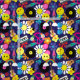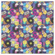 Funky hippie fabric printed with rainbows, vinyl LPs, peace symbols, flowers, cassette tapes and retro sunglasses over a dark blue background