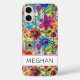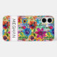 Make a retro statement with this groovy 70s inspired hippie flower power iphone 16 plus phone case! It's modern and trendy with bright multi-colored watercolor flowers. Make it uniquely yours with your name in a mod CAP font in black. It will look fabulous on your phone!