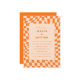 Plain white envelopes are included with paper invitations and will come to fit the invitation size you select. If you don’t need the envelopes, you may choose to not receive them by selecting the dropdown below "Envelopes" and choosing "None." If you’d like to have a design on your envelopes, you can browse all of these available envelopes to find the design that complements your Groovy Retro Orange Abstract Checkerboard Wedding Invitation.