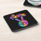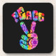 Groovy drink coaster set features retro style tie dye peace sign hand with curved text