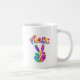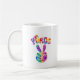 Groovy coffee mug features retro style tie dye peace sign hand with curved text