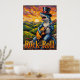 This captivating painting features a "groovy" blue shark, complete with a top hat and red sunglasses, engaged in a "golden hour jam" on an electric guitar. It stands on a rocky outcrop, overlooking a landscape of green hills and trees under a stunning, textured sunset sky. The vibrant, impasto technique creates a lively and exhilarating atmosphere, perfectly conveying the "ROCK and ROLL" vibe.