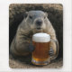 A groundhog is humorously holding a large mug of frothy beer outside its burrow.