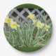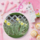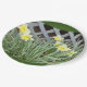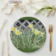 A 9 inch Paper Plate, with a Picture of a Group of Daffodils, on it, dark Green Background.