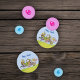 This table confetti has large circles with a group of Easter bunnies in pastel coloured clothing running in the grass carrying baskets with yellow chicks and coloured eggs. Customise the Happy Easter text with the template. Medium circles are pink with a bright pink Easter egg, small circles are blue with a blue Easter egg.