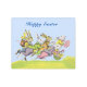 This metal wall print has a group of running Easter rabbits on grass dressed in pastel colored clothing carrying baskets filled with colored eggs under a blue sky. Customize the Happy Easter text with the template.