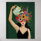 This art print features a painting of a woman whos head is covered in flowers watering the flowers growing from her mind against a deep textured emerald background.