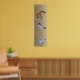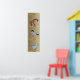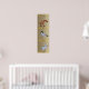 Dolls mark growth of child. Duck for 1-2 feet, Unicorn for 2-3 feet and giraffe from 4 to 5 feet. Measure child's growth against beige textured background. Yellow lines at 2 feet (measure from floor), 3, 4, and 5 feet. Inches marked between lines as 1,2,3,4,5,6,7,8,9,0,1,2 (on yellow line).