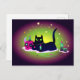 Big Black Grumpy Cat Vinsant lies next to the pink skull and green occult candles. He is displeased and rolls his eyes. Cool postcard for a Halloween party or just a beautiful present for a gothic friend or a witch friend