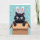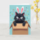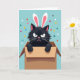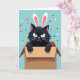 This card features a fluffy black cat peeking out of an open-top cardboard box, its front paws resting on the edge as if it’s been coaxed into joining the fun. Tall bunny ears sit on its head, bright white with soft pink inner panels, adding a sweet, teasing touch 🐰. The cat’s narrowed eyes and furrowed brows give it a stubborn, pouty look, like it’s trying to resist a friendly joke while still staying close. A small pink nose and downturned mouth heighten that “not impressed” expression, while long white whiskers spread across its cheeks in a delicate fan. Behind the cat, the background is a smooth sky-blue field sprinkled with round confetti dots in red, yellow, green, and pink, turning the scene into a party-like setting 🌷. Any lettering would sit neatly near the top in a simple white style so it stands out clearly against the blue. The cat’s upper body fills most of the frame, with the box rim forming a soft horizontal line across the lower portion.