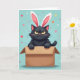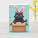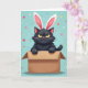 This design shows a fluffy, dark-furred cat peeking out of a plain cardboard box, wearing tall bunny ears in white with soft pink inner details 🐰. Its narrowed yellow eyes, pinched brow, and small frown give it an unimpressed look, like it’s tolerating the scene for someone it secretly cares about. The cat’s short, dark paws curl over the box edge as if it’s deciding whether to stay tucked in or climb out to join a friend. Behind it, a bright aqua background sets a party-like mood, dotted with scattered circles in red, orange, pink, yellow, white, and a hint of purple 🌷. Near the top, a short holiday greeting appears in a simple, easy-to-read style in white, centered against the blue so it stands out clearly. The layout keeps the cat and box centered, letting the bunny ears rise into the open space while the confetti dots float around like gentle teasing. The box is a light brown with subtle shading along the rim, and the bunny ears tilt slightly outward above the cat’s dark head.