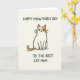 Designed with a minimalist illustration of a seated house cat centered on a creamy off-white background, the card keeps the focus on one expressive character. The cat is mostly white with ginger-brown accents on the ears, a patch over part of the face, and a tail that curls neatly to the side. Its brows pinch inward and its eyes narrow in a dry, unimpressed stare, like it’s secretly guarding a soft spot for someone it won’t openly admit ❤️. The simple pose—paws tucked close and body upright—adds a tidy, affectionate calm that contrasts with the cat’s stubborn look. A hand-drawn style message sits above and below the cat, with dark lettering that stands out clearly against the pale background. The placement frames the cat like a little stage, letting the humorous contrast feel like a teasing note between close friends or family 🌼. The ginger-brown tail curves to the right, finishing in a tight curl near the cat’s side.