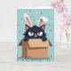 This card shows a dark-furred cat peeking out of a plain cardboard box, its narrowed eyes and downturned mouth giving it a stubborn, funny glare. On its head sit long bunny ears, creamy white with soft pink centers, making the cat look like it’s been talked into joining the celebration 🐰. The cat is centered on the front, so its grumpy face becomes the main focus, yet the costume adds a sweet, friendly twist as if someone nearby is teasing it with affection. Behind it, a light blue background is sprinkled with small round dots in reds, oranges, whites, and cool blues, like confetti drifting through the air 🌷. Some of the dots gather near the bottom edge around the box, hinting at a party mess that’s still settling. A short Easter greeting appears near the top in a simple, easy-to-read style, set in a darker contrasting color against the blue. The box is drawn with light brown panels and crisp edges, with the cat’s ears rising above the rim and the scattered dots floating all around.