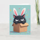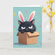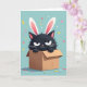The front design shows a fluffy, dark charcoal cat-like character popping up from a simple brown cardboard box, wearing oversized white bunny ears with soft pink inner details 🐰. Its slightly furrowed brow and narrowed eyes give it a grumpy-cute look, like it’s trying not to smile while still joining the fun. The background is a smooth aqua tone, making the darker fur and bright ears stand out clearly. Confetti floats and falls all around in small dots and short rectangles colored pink, yellow, and red, adding a party feel with a friendly, teasing edge. A light blue-green surface below catches a few pieces of confetti, and the box sits centered to ground the scene. Any greeting text appears near the top in a simple white font, leaving the character unobstructed and easy to notice 🌷. The box has crisp edges, warm brown shading, and a few confetti pieces resting along its rim.