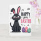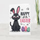This card features a dark-furred bunny 🐰 front and center, with long ears tipped in soft pink and a slightly grumpy face that’s softened by faint blush marks, like it’s pretending not to be charmed. To the right, the word “HAPPY” sits in black uppercase letters, with a smaller, loopy black word tucked just above the larger “EASTER” in bright pink. Curly black flourishes and tiny dot accents surround the lettering, giving the layout a flirtatious, teasing energy without crowding the white background. The bunny’s narrowed eyes and set mouth feel like a humorous side-eye aimed at the greeting, as if it’s sharing the moment with a close friend who knows it well. Beneath the text, three decorated egg shapes add gentle color, dotted in lilac, soft rose, and muted teal, with a calm, springlike touch 🌷. A light shadow under the eggs suggests a surface while keeping the design flat and graphic. The background stays plain white, and the eggs sit in a neat row with scattered polka dots and simple outlines.