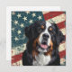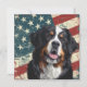 A watercolor portrait of a beautiful Bernese Mountain Dog is placed against a grunge background of the USA flag. The back of this all occasion flat card has a text field for you to customize.