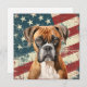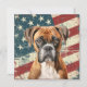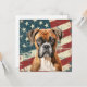 A watercolor portrait of a beautiful Boxer Dog is placed against a grunge background of the USA flag. The back of this all occasion flat card has a text field for you to customize.