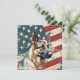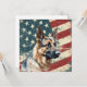 A watercolor portrait of a beautiful German Shepherd Dog is placed against a grunge background of the USA flag. The back of this all occasion flat card has a text field for you to customize.