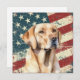 A watercolor portrait of a beautiful yellow Labrador Retriever Dog is placed against a grunge background of the USA flag. The back of this all occasion flat card has a text field for you to customize.