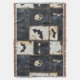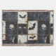 Distressed denim Halloween pattern blanket with bats, skulls, and dark heart designs on a black and cream grid. Gothic, grunge, and eerie aesthetic—ideal for spooky décor, alternative gifts, and Halloween party style.