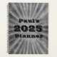 This yearly planner features a gray striped, grunge starburst pattern on it with customizable text that says, "Paul's 2024 Planner" on it but you can change it to say whatever you want.