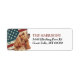 The left side of these return address labels feature a watercolor portrait of a beautiful buff colored Cocker Spaniel dog placed against a grunge background of the USA flag. Your custom text is in matching red and black at the right.