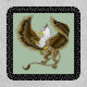 A brown and white fantasy griffin is in flight in a backdrop of sage green