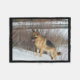 Gorgeous black & tan Alsatian on the snowy bank of a river