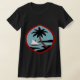 The design is based on the coat of arms of Guam, showing land, sea and sky, with an ancient flying proa (canoe) approaching the beach near the mouth of the Agana River, and a palm tree in the foreground