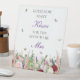Feminine and modern, this "Guess How Many Kisses" pedestal sign uses a design that features a lovely garden of watercolor pink and purple flowers including roses, tulips, lavender and eucalyptus greenery with bright colored butterflies and bumble bees flying around.
