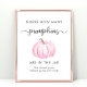 Cute game sign for your baby girl shower with "Guess How Many Pumpkins" written simple grey typography and a stylish script with swashes and a watercolor of a pastel pink pumpkin. Place a jar filled with candy pumpkins underneath and ask your guests to guess how many are in the jar. The winner will be the guest who gets closest without going over. Matching guess cards are available in our Sweet Little Pumpkin Baby Girl Shower Collection.