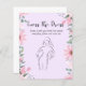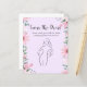 This is a printable bridal shower game card titled "Guess the Dress". The design has a light purple background and is framed by a decorative border of pink and white flowers with green leaves. The title is written in a whimsical script font. Below the title, the instructions, "Draw what you think the bride wedding dress will look like," are written in a simple, handwritten-style font. The center of the card features a simple black-and-white line drawing of a woman in a standing pose, providing a blank canvas for guests to sketch their predictions of the wedding dress.