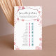 This baby shower game card features a script modern font on blush pink and rose gold dots background, perfect for a baby girl!