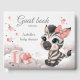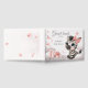 Cute baby shower or birthday guest book featuring adorable little female zebra wearing a cute pink bow sitting on clouds with some love hearts