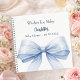 A white background color. Decorated with a large light blue bow. Personalize and add the name and date. Title: Wishes for Baby.