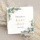 A white background color. Decorated with eucalyptus greenery and golden foliage. Add a name and a date.