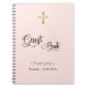 A blush, rose gold background color, decorated with a golden cross. Add a name and a date. The text: Guest Book is written with a modern hand lettered style script.