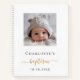 For an elegant baptism, gender neutral. A chic white background. Personalize and add a square sized photo on the front, the name of the child and the date of the baptism. Black and golden letters.