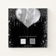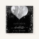 A stylish black background with faux silver glitter drips and dust. Decorated with purple balloons. Personalize and add a name, age and a date. The name is written with a modern hand lettered style script with swashes. To keep the swashes only delete the sample name, leave the spaces or emoji's in front and after the name.