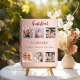 Create a unique photo collage. Use six, 6 of your favorite photos. Personalize and add a name and age, date. Rose gold background.