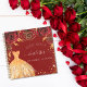 For a 18th (or any age) birthday party. A red background with faux gold glitter dust, a dress and red roses, florals. The name is written with a modern hand lettered style script. Personalize and add a name and date.