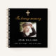 A guest book for a memorial service or funeral. A classic black background, a faux gold cross on the front. Personalize and add a photo, name and dates.