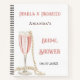 A white background color. Decorated with a glass of pink sparkling Prosecco and pearls. Add a name and a date.