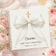 Celebrate her First Holy Communion with this luxurious guest book featuring a refined ivory bow adorned with delicate pearls and a subtle gold cross, set against a soft ivory background.