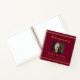 A guest book for a memorial service or funeral. A burgundy background, a faux gold frame on the front. Personalize and add a photo, name and dates.