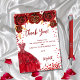 For a Quinceañera, 15h birthday party. A black background with red sparkles, confetti, a red dress. The name is written with a modern hand lettered style script with swashes. Personalize and add a name and date.